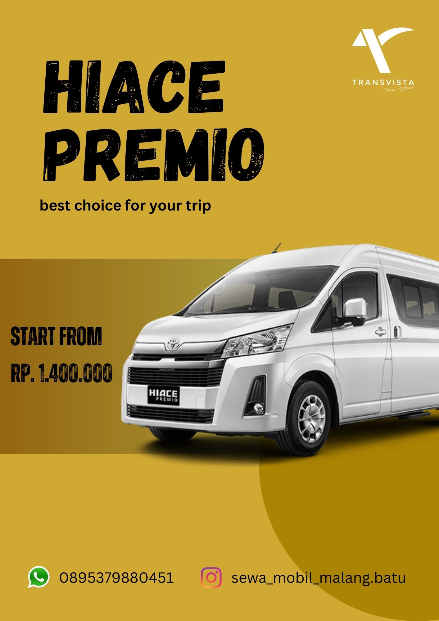 Kami menyediakan layanan sewa Toyota Hiace Premio yang nyaman, elegan, dan siap menunjang berbagai kebutuhan perjalanan Anda. Cocok untuk perjalanan wisata, dinas kantor, antar-jemput keluarga, hingga acara spesial seperti wedding dan ziarah.