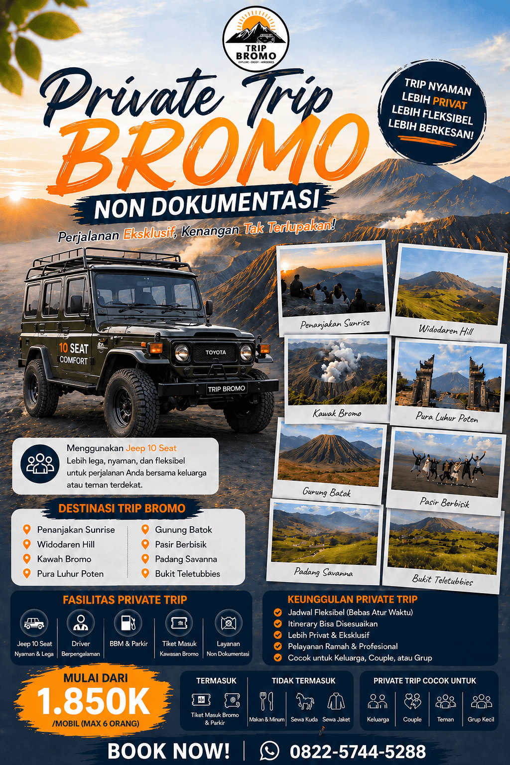 Nikmati pengalaman wisata ke Gunung Bromo dengan konsep private trip yang lebih nyaman, fleksibel, dan eksklusif tanpa harus bergabung dengan rombongan lain. Cocok untuk keluarga, pasangan, maupun grup kecil hingga menengah.
